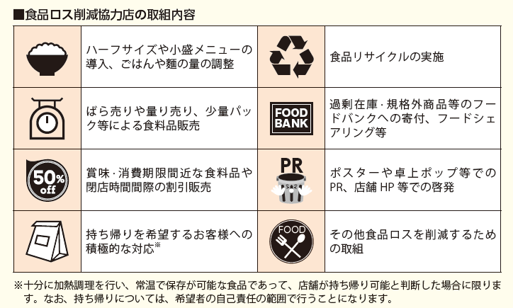 | 7 | 食品ロス削減の啓発 | ○ポスターや卓上ポップ等でのPR ○店舗ホームページ等での啓発 |