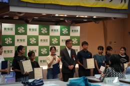 最優秀賞、優秀賞に選ばれた参加者のみなさんと区長、審査員最優秀賞