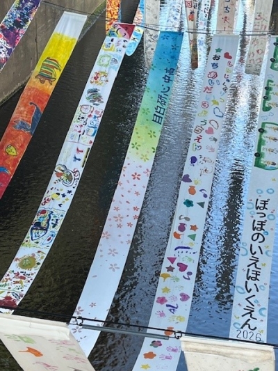 染の小道2026 川のギャラリーに幼稚園の作品が展示されました。