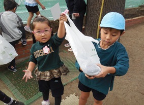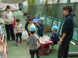 お客さんは4歳児ちょうちょう組さん。「いらっしゃいませ。芋ほり屋さんです。」