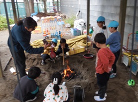 砂場で火をおこします。火吹き竹や、団扇を使いました。ほのおが上がってきました。「パチパチ音がするね。」「あったかいね。」発見や驚きがたくさんありました。