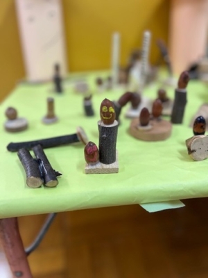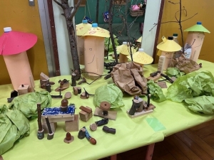 4歳児ちょうちょう組さんが、ドングリや枝を使って森を作りました。以前、作ったキノコたちもやってきました。