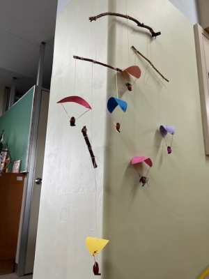 ドングリを使ったモビールです。幼稚園玄関でゆらゆらと風に乗っています。
