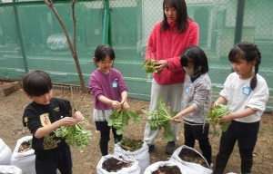 お味噌汁にしました。4歳児ちょうちょう組さんにも、おすそ分け。「おいしい?」「うん。おいしいよ!」