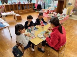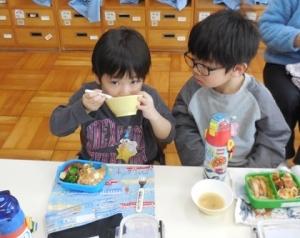 今回は野菜スープにしました。4歳児ちょうちょう組さんでは、「(苦手な)にんじんたべられたよ!」