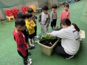 5歳児そら組さんが大根を収穫しました。ちょっと小さめの大根でした。「かわいいサイズだね。」