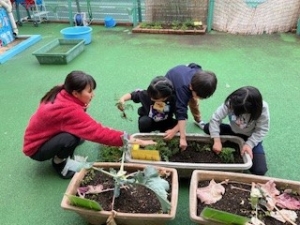 5歳児そら組さんは人参の収穫です。小さかったり細かったりしましたが、たくさん収穫できました。
