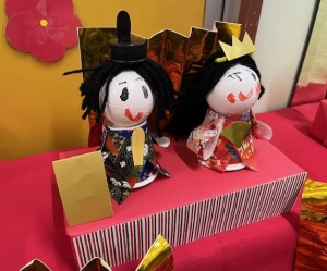 4歳児ちょうちょう組さんの作ったおひなさまです。紙コップとスチロール球、毛糸を使いました。お着物は千代紙を使っています。
