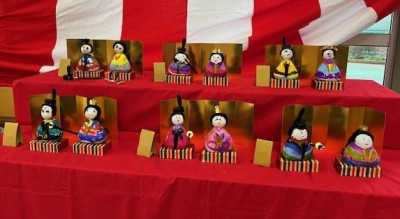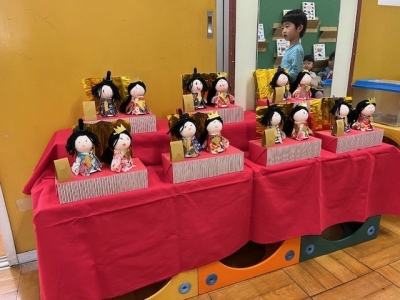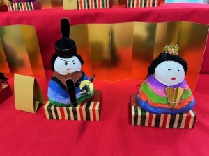 5歳児そら組さんの作品です。紙粘土で形を作り、毛糸の髪の毛、アクリル絵の具のお着物、ビーズやスパンコールなどを使った付属品もさすがの出来です。