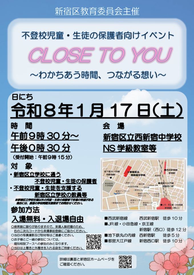 新宿区教育委員会では、新宿区立学校に通う不登校児童・生徒の保護者及び新宿区立学校教員等を対象にイベントを開催します。
