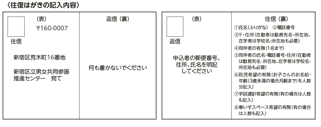 往復はがきに必要事項を記入し、申込先までご郵送ください。
