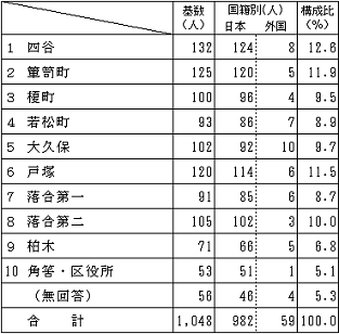 基数 国籍別 構成比 日本 外国 四谷 132 124 8 12.6% 簞笥町 125 120 5 11.9% 榎町 100 96 4 9.5% 若松町 93 86 7 8.9% 大久保 102 92 10 9.7% 戸塚 120 114 6 11.5% 落合第一 91 85 6 8.7% 落合第二 105 102 3 10.0% 柏木 71 66 5 6.8% 角筈・区役所 53 51 1 5.1% 無回答 56 46 4 5.3% 合計 1,048 982 59