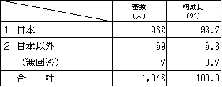基数 構成比 日本 982 93.7% 日本以外 59 5.6% 無回答 7 0.7% 合計 1,048