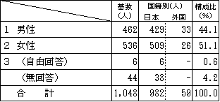 基数 国籍別 構成比 日本 外国 男性 462 429 33 44.1% 女性 536 509 26 51.1% 自由回答 6 6 - 0.6% 無回答 44 38 - 4.2% 合計 1,048 982 59