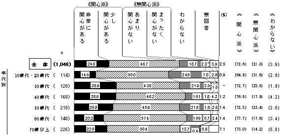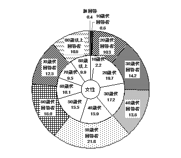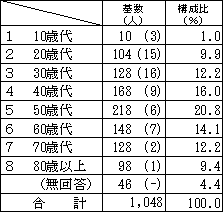年代 基数 構成比 基数のうちインターネットによる回収数の割合 10歳代 10(3) 1.0% 80.0% 20歳代 104(15) 9.9% 66.3% 30歳代 128(16) 12.2% 65.6% 40歳代 168(9) 16.0% 64.9% 50歳代 218(6) 20.8% 44.5% 60歳代 148(7) 14.1% 29.1% 70歳代 128(2) 12.2% 12.5% 80歳以上 98(1) 9.4% 3.1% 無回答 46(-) 4.4% 50.0% 合計 1,048