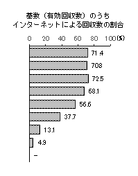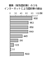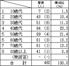 年代 基数 構成比 基数のうちインターネットによる回収数の割合 10歳代 7(2) 1.5% 71.4% 20歳代 48(8) 10.4% 70.8% 30歳代 51(6) 11.0% 72.5% 40歳代 94(8) 20.3% 68.1% 50歳代 99(4) 21.4% 56.6% 60歳代 61(3) 13.2% 37.7% 70歳代 61(1) 13.2% 13.1% 80歳以上 41(1) 8.9% 4.9% 無回答 -(-) - - 合計 462
