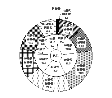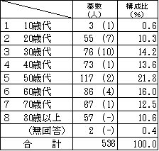 年代 基数 構成比 基数のうちインターネットによる回収数の割合 10歳代 3(1) 0.6% 100.0% 20歳代 55(7) 10.3% 61.8% 30歳代 76(10) 14.2% 60.5% 40歳代 73(1) 13.6% 60.3% 50歳代 117(2) 21.8% 34.2% 60歳代 86(4) 16.0% 23.3% 70歳代 67(1) 12.5% 11.9% 80歳以上 57(-) 10.6% 1.8% 無回答 2(-) 0.4% - 合計 536