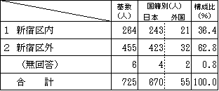 基数 国籍別 構成比 日本 外国 新宿区内 264 243 21 36.4% 新宿区外 455 423 32 62.8% 無回答 6 4 2 0.8% 合計 725 670 55