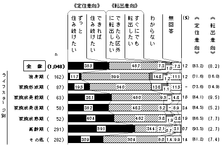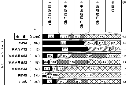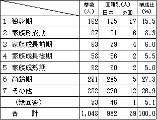基数 国籍別 構成比 日本 外国 独身期 162 135 27 15.5% 家族形成期 87 81 6 8.3% 家族成長前期 63 59 4 6.0% 家族成長後期 58 56 2 5.5% 家族成熟期 52 50 2 5.0% 高齢期 291 285 5 27.8% その他 282 270 12 26.9% 無回答 53 46 1 5.1% 合計 1,048 982 59