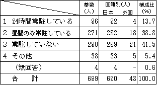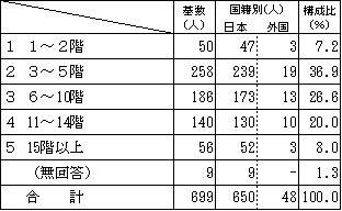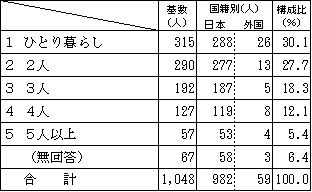 基数 国籍別 構成比 日本 外国 ひとり暮らし 315 288 26 30.1% 2人 290 277 13 27.7% 3人 192 187 5 18.3% 4人 127 119 8 12.1% 5人以上 57 53 4 5.4% 無回答 67 58 3 6.4%
