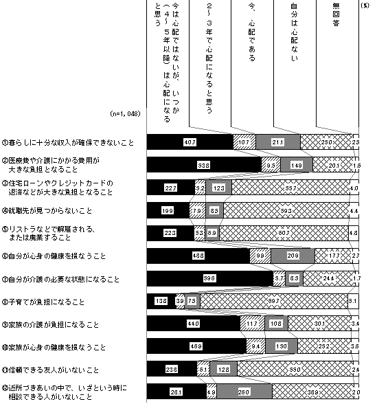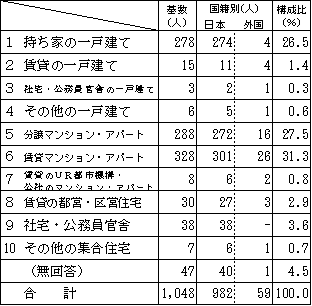 基数 国籍別 構成比 日本 外国 ひとり暮らし(なし) 315 288 26 30.1% 子 311 298 13 29.7% 妻または夫 508 490 18 48.5% 親 125 122 3 11.9% 祖父母 6 6 - 0.6% 孫 23 23 - 2.2% 兄弟姉妹 53 48 5 5.1% その他 24 20 4 2.3% 無回答 51 44 1 4.9% 合計 1,048 982 59