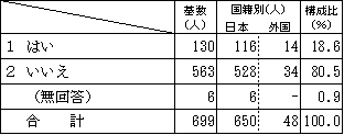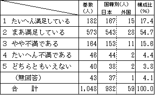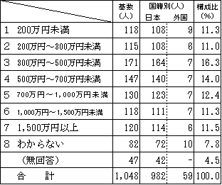 基数 国籍別 構成比 日本 外国 会社員、公務員、団体職員 440 414 26 42.0% パート・アルバイト・非常勤・嘱託・派遣など 127 117 10 12.1% 自営業・自由業 122 114 8 11.6% 学生 36 25 11 3.4% 専業主婦・主夫 95 93 2 9.1% その他 12 12 - 1.1% 無職 168 166 2 16.0% 無回答 48 41 - 4.6% 合計 1,048 982 59
