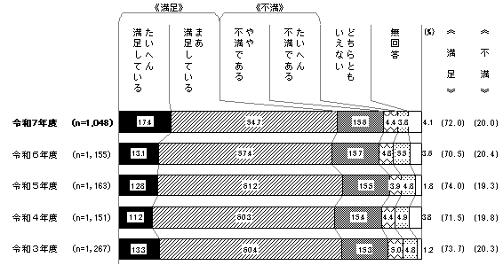 「防犯・地域安全対策」は令和6年度から6.7ポイント増加し、平成21年度以降では最も高くなっている。「震災・水害対策」も令和6年度より1.6ポイント増加し、平成27年度以降では最も高くなっている。「高齢者福祉の充実」は令和6年度から2.0ポイント減少、「子育て支援(少子化対策)」も2.2ポイント減少している。
