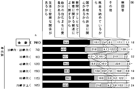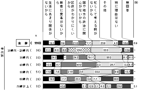 「忙しくて考える暇がないから」は10歳代・20歳代と50歳代が3割台半ば近く、30歳代が約3割。「区政がわかりにくいから」は、30歳代が2割台半ば近く。「生活にあまり関係がないから」は70歳以上が4割台半ば近く、「国や地方の政治に関心がないから」は10歳代・20歳代が2割台半ば、「新宿に愛着がないから」は10歳代・20歳代が1割近くで、それぞれ最も高い。