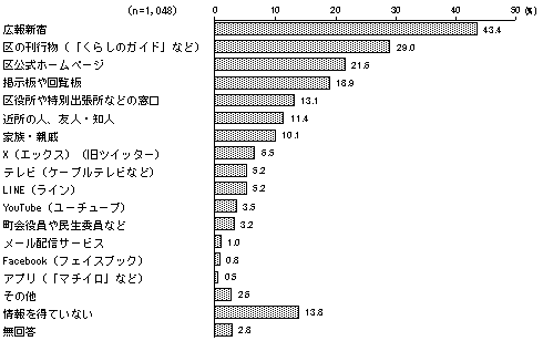 区の行政サービスの情報取得手段 構成比 回答者 1,048人 広報新宿 43.4% 区の刊行物(「くらしのガイド」など) 29.0% 区公式ホームページ 21.6% 掲示板や回覧板 18.9% 区役所や特別出張所などの窓口 13.1% 近所の人、友人・知人 11.4% 家族・親戚 10.1% X(エックス)(旧ツイッター) 6.5% テレビ(ケーブルテレビなど) 5.2% LINE(ライン) 5.2% YouTube(ユーチューブ) 3.5% 町会役員や民生委員など 3.2% メール配信サービス 1.0% Facebook(フェイスブック) 0.8% アプリ(「マチイロ」など) 0.5% その他 2.6% 情報を得ていない 13.8% 無回答 2.8%