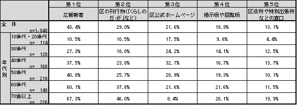 「広報新宿」、「区の刊行物(「くらしのガイド」など)」、「掲示板や回覧板」は年代が上がるにつれ高くなる傾向がある。70歳以上で「広報新宿」は6割台半ばを超え、「区の刊行物(「くらしのガイド」など)」は4割台半ばを超え、「掲示板や回覧板」は2割台半ばを超え、それぞれ最も高くなっている。「区公式ホームページ」は40歳代が3割強、「区役所や特別出張所などの窓口」は70歳以上が2割弱で、それぞれ最も高くなっている。