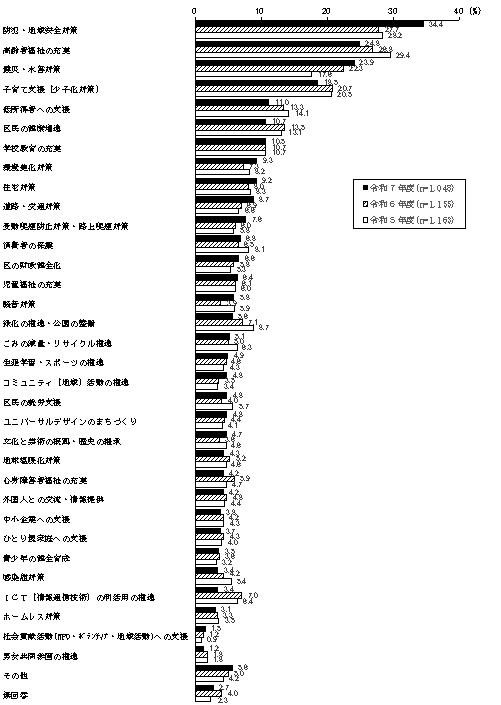 回答者 1,048人 1,155人 1,163人 令和7年度 令和6年度 令和5年度 防犯・地域安全対策 34.4% 27.7% 28.2% 高齢者福祉の充実 24.8% 26.8% 29.4% 震災・水害対策 23.9% 22.3% 17.6% 子育て支援(少子化対策) 18.5% 20.7% 20.5% 低所得者への支援 11.0% 13.3% 14.1% 区民の健康増進 10.7% 13.5% 13.1% 学校教育の充実 10.5% 10.7% 10.7% 環境美化対策 9.3% 7.3% 8.2% 住宅対策 9.2% 8.0% 8.3% 道路・交通対策 8.7% 6.9% 6.6% 受動喫煙防止対策・路上喫煙対策 7.6% 6.0% 5.8% 消費者の保護 6.8% 6.5% 8.1% 区の財政健全化 6.6% 5.8% 5.3% 児童福祉の充実 6.4% 6.1% 6.0% 騒音対策 5.8% 3.9% 5.9% 緑化の推進・公園の整備 5.6% 7.1% 8.7% ごみの減量・リサイクル推進 5.1% 5.0% 6.3% 生涯学習・スポーツの推進 4.9% 4.6% 4.3% コミュニティ(地域)活動の推進 4.8% 3.5% 3.4% 区民の就労支援 4.8% 4.0% 5.7% ユニバーサルデザインのまちづくり 4.8% 4.4% 4.1% 文化と芸術の振興・歴史の継承 4.7% 3.6% 4.6% 地球温暖化対策 4.3% 5.2% 4.6% 心身障害者福祉の充実 4.2% 5.9% 4.7% 外国人との交流・情報提供 4.2% 4.8% 4.4% 中小企業への支援 3.8% 4.2% 4.3% ひとり親家庭への支援 3.7% 4.3% 4.0% 青少年の健全育成 3.5% 3.6% 3.2% 感染症対策 3.4% 4.2% 5.4% ICT(情報通信技術)の利活用の推進 3.4% 7.0% 6.4% ホームレス対策 3.1% 3.3% 3.5% 社会貢献活動(NPO・ボランティア・地域活動)への支援 1.5% 1.2% 0.9% 男女共同参画の推進 1.2% 1.8% 1.8% その他 5.6% 5.0% 4.2% 無回答 2.7% 4.0% 2.3%