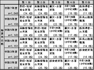 令和7年度 回答者 1,048人 第1位 防犯・地域安全対策 34.4% 第2位 高齢者福祉の充実 24.8% 第3位 震災・水害対策 23.9% 第4位 子育て支援(少子化対策) 18.5% 第5位 低所得者への支援 11.0% 令和6年度 回答者 1,155人 第1位 防犯・地域安全対策 27.7% 第2位 高齢者福祉の充実 26.8% 第3位 震災・水害対策 22.3% 第4位 子育て支援(少子化対策) 20.7% 第5位 区民の健康増進 13.5% 令和5年度 回答者 1,163人 第1位 高齢者福祉の充実 29.4% 第2位 防犯・地域安全対策 28.2% 第3位 子育て支援(少子化対策) 20.5% 第4位 震災・水害対策 17.6% 第5位 低所得者への支援 14.1% 令和4年度 回答者 1,151人 第1位 高齢者福祉の充実 26.7% 第2位 防犯・地域安全対策 24.0% 第3位 震災・水害対策 19.3% 第4位 子育て支援(少子化対策) 19.2% 第5位 区民の健康増進 14.6% 令和3年度 回答者 1,267人 第1位 防犯・地域安全対策 26.9% 第2位 高齢者福祉の充実 24.3% 第3位 震災・水害対策 20.0% 第4位 子育て支援(少子化対策) 17.5% 第5位 感染症対策 16.8% 令和2年度 回答者 1,313人 第1位 防犯・地域安全対策 27.5% 第2位 高齢者福祉の充実 25.7% 第3位 感染症対策 23.2% 第4位 震災・水害対策 20.6% 第5位 子育て支援(少子化対策) 15.5% (注)「ICT(情報通信技術)の利活用の推進」は令和6年度以前は「IT(情報技術)化の推進」で聴取。