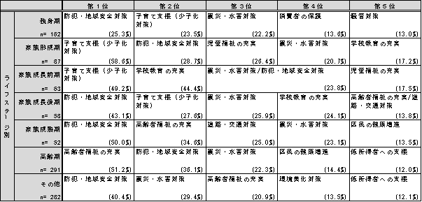 独身期 回答者 162人 第1位 防犯・地域安全対策 25.3% 第2位 子育て支援(少子化対策) 23.5% 第3位 震災・水害対策 22.2% 第4位 消費者の保護 13.6% 第5位 騒音対策 13.0% 家族形成期 回答者 87人 第1位 子育て支援(少子化対策) 58.6% 第2位 防犯・地域安全対策 28.7% 第3位 児童福祉の充実 26.4% 第4位 震災・水害対策 20.7% 第5位 学校教育の充実 17.2% 家族成長前期 回答者 63人 第1位 子育て支援(少子化対策) 49.2% 第2位 学校教育の充実 44.4% 第3位 震災・水害対策/防犯・地域安全対策 23.8% 第4位 第5位 児童福祉の充実 17.5% 家族成長後期 回答者 58人 第1位 防犯・地域安全対策 43.1% 第2位 子育て支援(少子化対策) 27.6% 第3位 震災・水害対策 25.9% 第4位 学校教育の充実 24.1% 第5位 高齢者福祉の充実/道路・交通対策 13.8% 家族成熟期 回答者 52人 第1位 防犯・地域安全対策 50.0% 第2位 高齢者福祉の充実 34.6% 第3位 道路・交通対策 25.0% 第4位 震災・水害対策 23.1% 第5位 区民の健康増進 13.5% 高齢期 回答者 291人 第1位 高齢者福祉の充実 51.2% 第2位 防犯・地域安全対策 36.1% 第3位 震災・水害対策 22.3% 第4位 区民の健康増進 14.4% 第5位 低所得者への支援 12.0% その他 回答者 282人 第1位 防犯・地域安全対策 40.4% 第2位 震災・水害対策 29.4% 第3位 高齢者福祉の充実 20.9% 第4位 環境美化対策 13.5% 第5位 低所得者への支援 12.1% (注)同率のものは、同一順位として併記している。