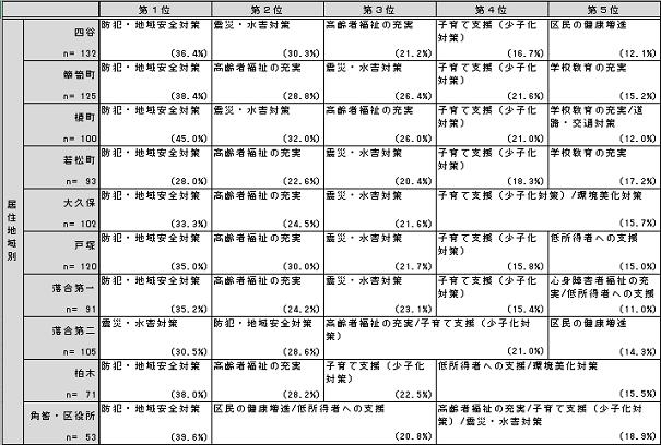 四谷 回答者 132人 第1位 防犯・地域安全対策 36.4% 第2位 震災・水害対策 30.3% 第3位 高齢者福祉の充実 21.2% 第4位 子育て支援(少子化対策) 16.7% 第5位 区民の健康増進 12.1% 簞笥町 回答者 125人 第1位 防犯・地域安全対策 38.4% 第2位 高齢者福祉の充実 28.8% 第3位 震災・水害対策 26.4% 第4位 子育て支援(少子化対策) 21.6% 第5位 学校教育の充実 15.2% 榎町 回答者 100人 第1位 防犯・地域安全対策 45.0% 第2位 震災・水害対策 32.0% 第3位 高齢者福祉の充実 26.0% 第4位 子育て支援(少子化対策) 21.0% 第5位 学校教育の充実/道路・交通対策 12.0% 若松町 回答者 93人 第1位 防犯・地域安全対策 28.0% 第2位 高齢者福祉の充実 22.6% 第3位 震災・水害対策 20.4% 第4位 子育て支援(少子化対策) 18.3% 第5位 学校教育の充実 17.2% 大久保 回答者 102人 第1位 防犯・地域安全対策 33.3% 第2位 高齢者福祉の充実 24.5% 第3位 震災・水害対策 21.6% 第4位 子育て支援(少子化対策)/環境美化対策 15.7% 第5位 戸塚 回答者 120人 第1位 防犯・地域安全対策 35.0% 第2位 高齢者福祉の充実 30.0% 第3位 震災・水害対策 21.7% 第4位 子育て支援(少子化対策) 15.8% 第5位 低所得者への支援 15.0% 落合第一 回答者 91人 第1位 防犯・地域安全対策 35.2% 第2位 高齢者福祉の充実 24.2% 第3位 震災・水害対策 23.1% 第4位 子育て支援(少子化対策) 15.4% 第5位 心身障害者福祉の充実/低所得者への支援 11.0% 落合第二 回答者 105人 第1位 震災・水害対策 30.5% 第2位 防犯・地域安全対策 28.6% 第3位 高齢者福祉の充実/子育て支援(少子化対策) 21.0% 第4位 第5位 区民の健康増進 14.3% 柏木 回答者 71人 第1位 防犯・地域安全対策 38.0% 第2位 高齢者福祉の充実 28.2% 第3位 子育て支援(少子化対策) 22.5% 第4位 低所得者への支援/環境美化対策 15.5% 第5位 角筈・区役所 回答者 53人 第1位 防犯・地域安全対策 39.6% 第2位 区民の健康増進/低所得者への支援 20.8% 第3位 第4位 高齢者福祉の充実/子育て支援(少子化対策)/震災・水害対策 18.9% 第5位 (注)同率のものは、同一順位として併記している。