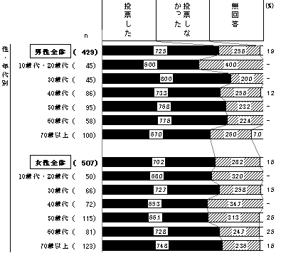 男性回答者 429人 45人 45人 86人 95人 58人 100人 男性全体 10歳代・20歳代 30歳代 40歳代 50歳代 60歳代 70歳以上 投票した 72.5% 60.0% 80.0% 73.3% 76.8% 77.6% 67.0% 投票しなかった 25.6% 40.0% 20.0% 25.6% 23.2% 22.4% 26.0% 無回答 1.9% - - 1.2% - - 7.0% 女性回答者 507人 50人 66人 72人 115人 81人 123人 女性全体 10歳代・20歳代 30歳代 40歳代 50歳代 60歳代 70歳以上 投票した 70.2% 68.0% 72.7% 65.3% 66.1% 72.8% 74.8% 投票しなかった 28.2% 32.0% 25.8% 34.7% 31.3% 24.7% 23.6% 無回答 1.6% - 1.5% - 2.6% 2.5% 1.6%