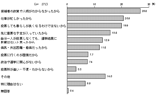 回答者 272人 候補者の政策や人柄がわからなかったから 26.8% 仕事が忙しかったから 20.6% 投票しても暮らしが良くなるわけではないから 19.9% 先に重要な予定が入っていたから 15.8% 自分一人が投票しなくても、選挙結果に影響はないと思ったから 12.9% 病気・外出困難・看病だったから 11.8% 投票に行くのが面倒だから 7.7% 政治や選挙に関心がないから 7.4% 投票所が遠い・不便・わからないから 3.3% その他 14.0% 特に理由はない 6.6% 無回答 0.4%