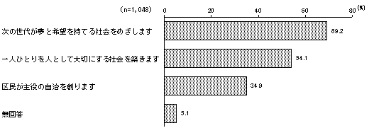 回答者 1,048人 次の世代が夢と希望を持てる社会をめざします 69.2% 一人ひとりを人として大切にする社会を築きます 54.1% 区民が主役の自治を創ります 34.9% 無回答 5.1%