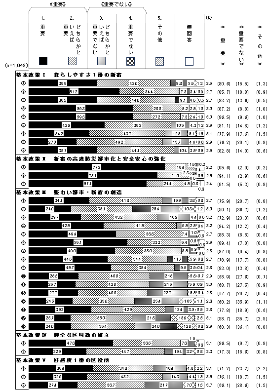 回答者 1,048人 基本政策I 暮らしやすさ1番の新宿 [1] [2] [3] [4] [5] [6] [7] [8] [9] 重要 38.6% 51.2% 38.5% 59.3% 59.3% 42.9% 34.2% 27.0% 38.7% どちらかといえば重要 42.0% 34.4% 44.8% 28.0% 27.2% 38.2% 43.7% 49.2% 44.1% どちらかといえば重要でない 9.8% 7.3% 9.1% 6.2% 7.3% 10.5% 12.5% 15.7% 10.4% 重要でない 5.6% 3.4% 4.6% 2.6% 2.4% 4.3% 5.1% 4.4% 3.6% その他 1.3% 0.9% 0.5% 1.0% 1.0% 1.2% 1.5% 0.8% 0.6% 無回答 2.6% 2.7% 2.7% 3.0% 3.0% 2.9% 3.1% 2.9% 2.6% 《重要》 80.6% 85.7% 83.2% 87.2% 86.5% 81.1% 77.9% 76.2% 82.8% 《重要でない》 15.5% 10.8% 13.6% 8.8% 9.6% 14.8% 17.6% 20.1% 14.0% 《その他》 1.3% 0.9% 0.5% 1.0% 1.0% 1.2% 1.5% 0.8% 0.6% 回答者 1,048人 基本政策II 新宿の高度防災都市化と安全安心の強化 [1] [2] [3] 重要 77.2% 73.1% 67.1% どちらかといえば重要 18.4% 21.0% 24.4% どちらかといえば重要でない 1.6% 2.3% 4.6% 重要でない 0.4% 0.6% 0.8% その他 0.2% 0.6% 0.8% 無回答 2.2% 2.5% 2.4% 《重要》 95.6% 94.1% 91.5% 《重要でない》 2.0% 2.9% 5.3% 《その他》 0.2% 0.6% 0.8%