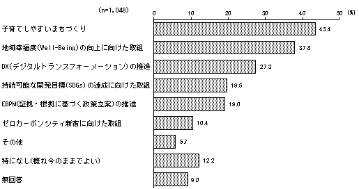 回答者 1,048人 子育てしやすいまちづくり 43.4% 地域幸福度(Well-Being)の向上に向けた取組 37.8% DX(デジタルトランスフォーメーション)の推進 27.3% 持続可能な開発目標(SDGs)の達成に向けた取組 19.6% EBPM(証拠・根拠に基づく政策立案)の推進 19.0% ゼロカーボンシティ新宿に向けた取組 10.4% その他 5.7% 特になし(概ね今のままでよい) 12.2% 無回答 9.0%