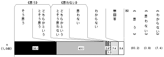 回答者 1,048人 そう思う 38.1% どちらかというとそう思う 45.1% どちらかというとそう思わない 2.6% 思わない 1.3% わからない 7.4% 無回答 5.4% 《思う》 83.2% 《思わない》 3.9% 《わからない》 7.4%
