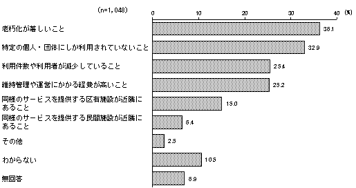 「老朽化が著しいこと」が3割台半ばを超えて最も高く、「特定の個人・団体にしか利用されていないこと」が3割強で続く
