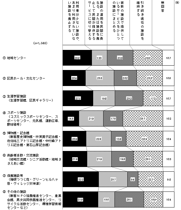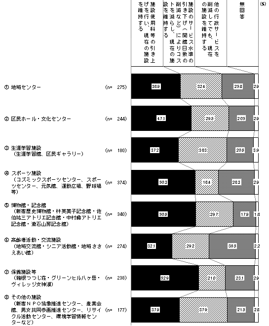 [1] 地域センター 回答者 275人 施設使用料等の引き上げを行い、現在の施設を維持する 38.9% 施設のサービス水準の引き下げ(開館日数の削減など)によりコストを減らし、現在の施設を維持する 32.4% 他の行政サービスを削減してでも、現在の施設を維持する 25.8% 無回答 2.9% [2] 区民ホール・文化センター 回答者 244人 施設使用料等の引き上げを行い、現在の施設を維持する 47.1% 施設のサービス水準の引き下げ(開館日数の削減など)によりコストを減らし、現在の施設を維持する 29.5% 他の行政サービスを削減してでも、現在の施設を維持する 20.5% 無回答 2.9% [3] 生涯学習施設(生涯学習館、区民ギャラリー) 回答者 180人 施設使用料等の引き上げを行い、現在の施設を維持する 37.2% 施設のサービス水準の引き下げ(開館日数の削減など)によりコストを減らし、現在の施設を維持する 38.3% 他の行政サービスを削減してでも、現在の施設を維持する 20.6% 無回答 3.9% [4] スポーツ施設(コズミックスポーツセンター、スポーツセンター、元気館、運動広場、野球場等) 回答者 374人 施設使用料等の引き上げを行い、現在の施設を維持する 50.3% 施設のサービス水準の引き下げ(開館日数の削減など)によりコストを減らし、現在の施設を維持する 18.4% 他の行政サービスを削減してでも、現在の施設を維持する 28.3% 無回答 2.9% [5] 博物館・記念館(新宿歴史博物館・林芙美子記念館・佐伯祐三アトリエ記念館・中村彝アトリエ記念館・漱石山房記念館) 回答者 340人 施設使用料等の引き上げを行い、現在の施設を維持する 50.6% 施設のサービス水準の引き下げ(開館日数の削減など)によりコストを減らし、現在の施設を維持する 29.7% 他の行政サービスを削減してでも、現在の施設を維持する 17.9% 無回答 1.8% [6] 高齢者活動・交流施設(地域交流館・シニア活動館・地域ささえあい館) 回答者 274人 施設使用料等の引き上げを行い、現在の施設を維持する 32.1% 施設のサービス水準の引き下げ(開館日数の削減など)によりコストを減らし、現在の施設を維持する 29.2% 他の行政サービスを削減してでも、現在の施設を維持する 36.5% 無回答 2.2% [7] 保養施設等(箱根つつじ荘・グリーンヒル八ヶ岳・ヴィレッジ女神湖) 回答者 238人 施設使用料等の引き上げを行い、現在の施設を維持する 52.9% 施設のサービス水準の引き下げ(開館日数の削減など)によりコストを減らし、現在の施設を維持する 21.0% 他の行政サービスを削減してでも、現在の施設を維持する 23.1% 無回答 2.9% [8] その他の施設(新宿NPO協働推進センター、産業会館、男女共同参画推進センター、リサイクル活動センター、環境学習情報センターなど) 回答者 177人 施設使用料等の引き上げを行い、現在の施設を維持する 37.9% 施設のサービス水準の引き下げ(開館日数の削減など)によりコストを減らし、現在の施設を維持する 37.9% 他の行政サービスを削減してでも、現在の施設を維持する 21.5% 無回答 2.8%