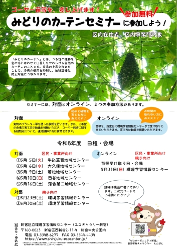 令和8年度は5月5日(火)から5月30日(土)まで、環境学習情報センター等にて、みどりのカーテンの育成方法について、セミナーを開催いたします。 |
