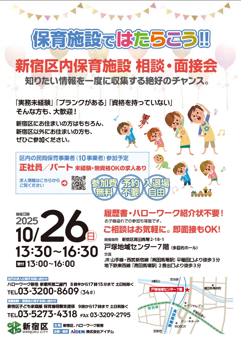 新宿区(区長:吉住健一)は10月26日(日)、保育施設で就職を希望する方を対象に、民間保育事業者合同の就職相談・面接会を開催する。