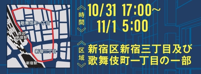 「新宿駅周辺地域の安全で秩序ある環境の確保に関する条例」に基づき、ハロウィン時期の新宿駅周辺地域での路上飲酒を制限し、迷惑行為や来街者の過度な集中による事故等の防止に努めます。
