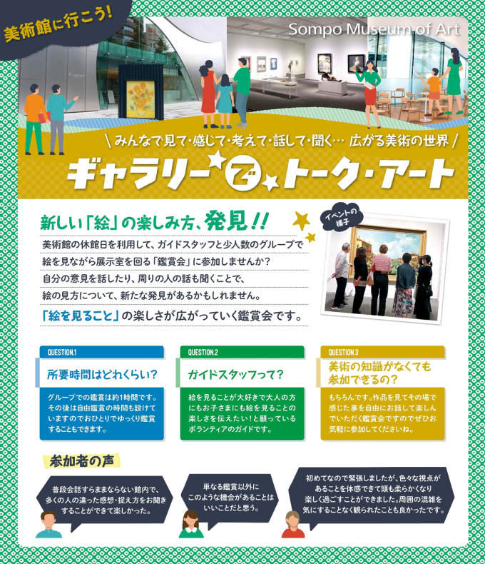 休館日に貸し切りの美術館で、ボランティアガイドと話をしてみませんか?作品解説を聞くのではなく、参加者が作品を見て、感じて、思うことを話しながら楽しむ参加型の作品鑑賞会です。