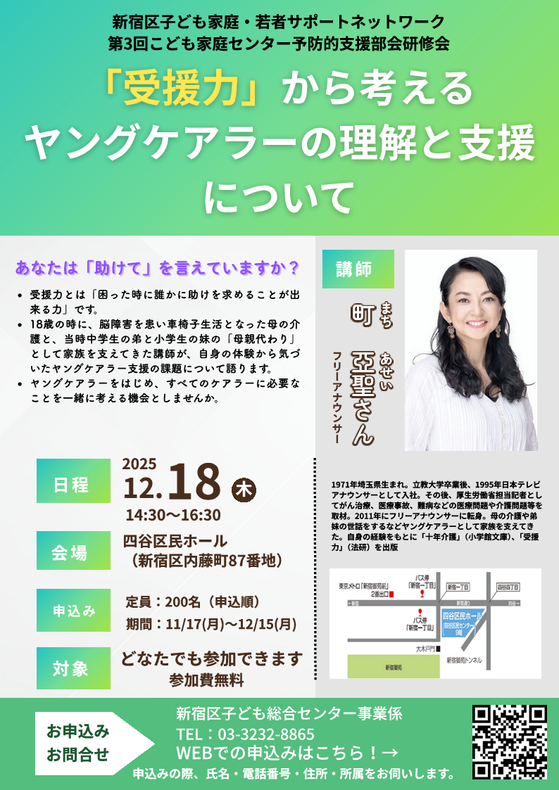 ※新宿区こども家庭センター予防的支援部会の研修の一環として、今回は一般の方も対象にした内容となります。一緒にヤングケアラーについて考えてみませんか。