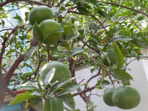 温州みかんの木に青々としたみかんの実がたくさんできました。食べごろが楽しみです。