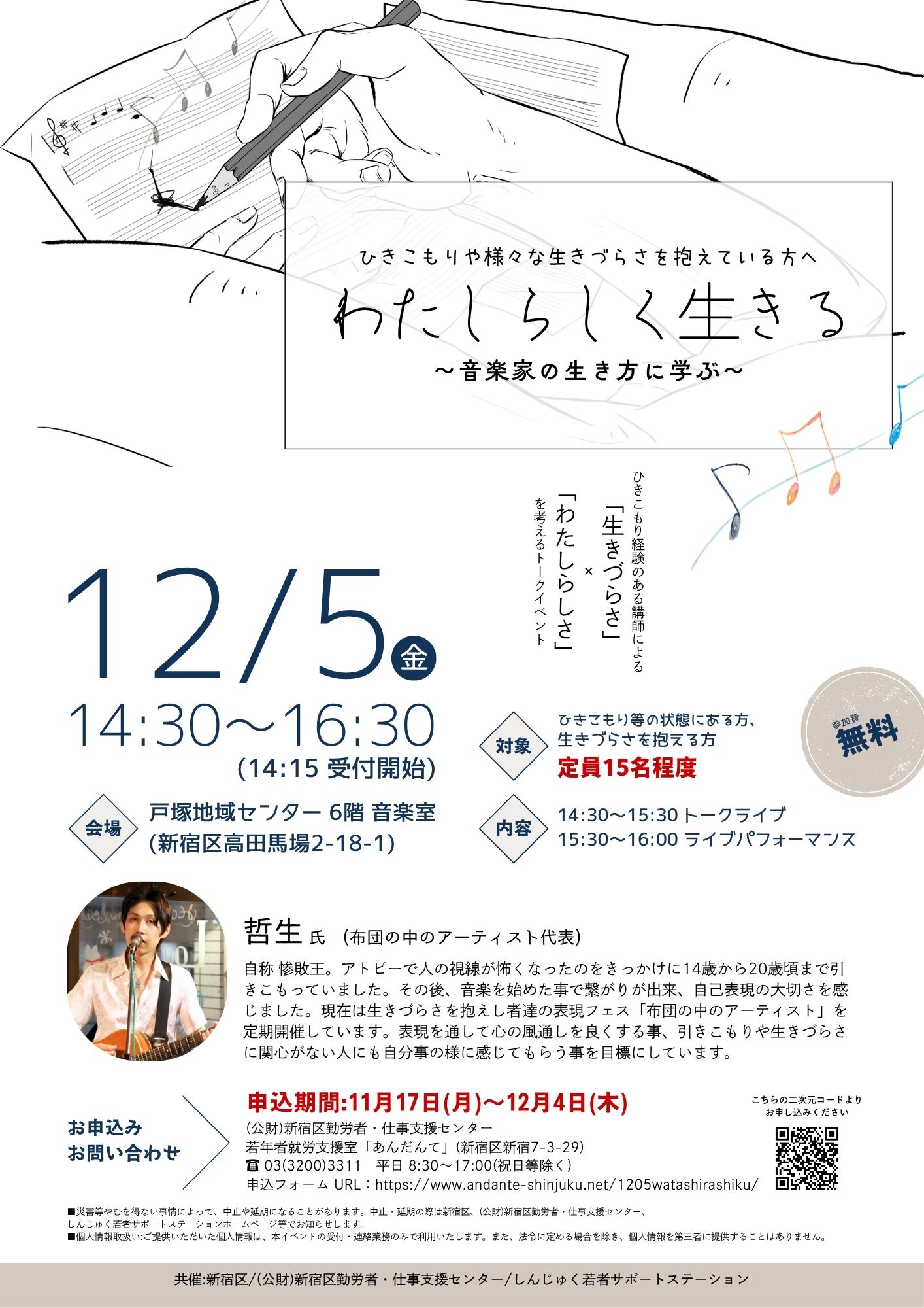 ひきこもりや様々な生きづらさを抱えている方を対象に、ひきこもり経験のある哲生さん(音楽家)をお招きし、トークライブを開催いたします。
