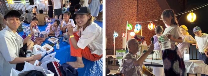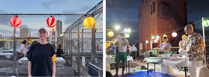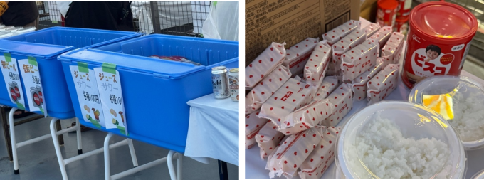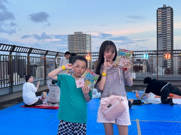 花火の打ち上げ開始にあわせてマンションの住民が続々と屋上に集まってきます。食事は各家庭で食べ物を持ち寄るスタイルとなっていますが、納涼大会の伝統として、飲み物を氷水で冷やす「どぶづけ」を理事会で用意し、キンキンに冷えたビールやジュースをお手頃価格で提供しています。